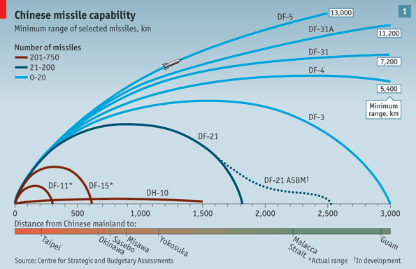 China relies on longer range ASBM, 1600km DF-21D and 4000km DF 26B. Both are flying at very high altitude and hypersonic speed (Mach 8-15).
